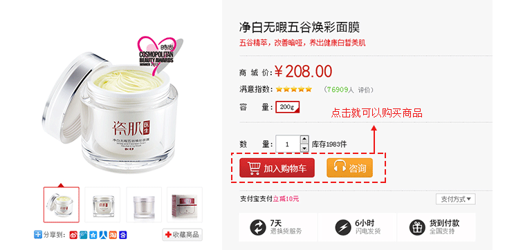 當您選定了一件商品后,在商品詳情頁點擊“購買”,商品會自動添加到您的購物車中。
