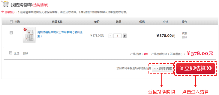 您可以點擊“繼續購物”按鈕,繼續挑選產品,或點擊“立即結算”按鈕,進入下一步;